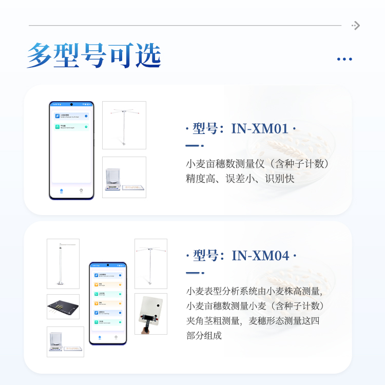 4)麦穗形态测定仪依托手机视觉技术,通过AI图像矫正算法一键获取穗长、小穗数等关键指标。全系统实现田间快速取样、批量分析及数据互联,为育种优化、产量预测和功能基因解析提供智能化解决方案。